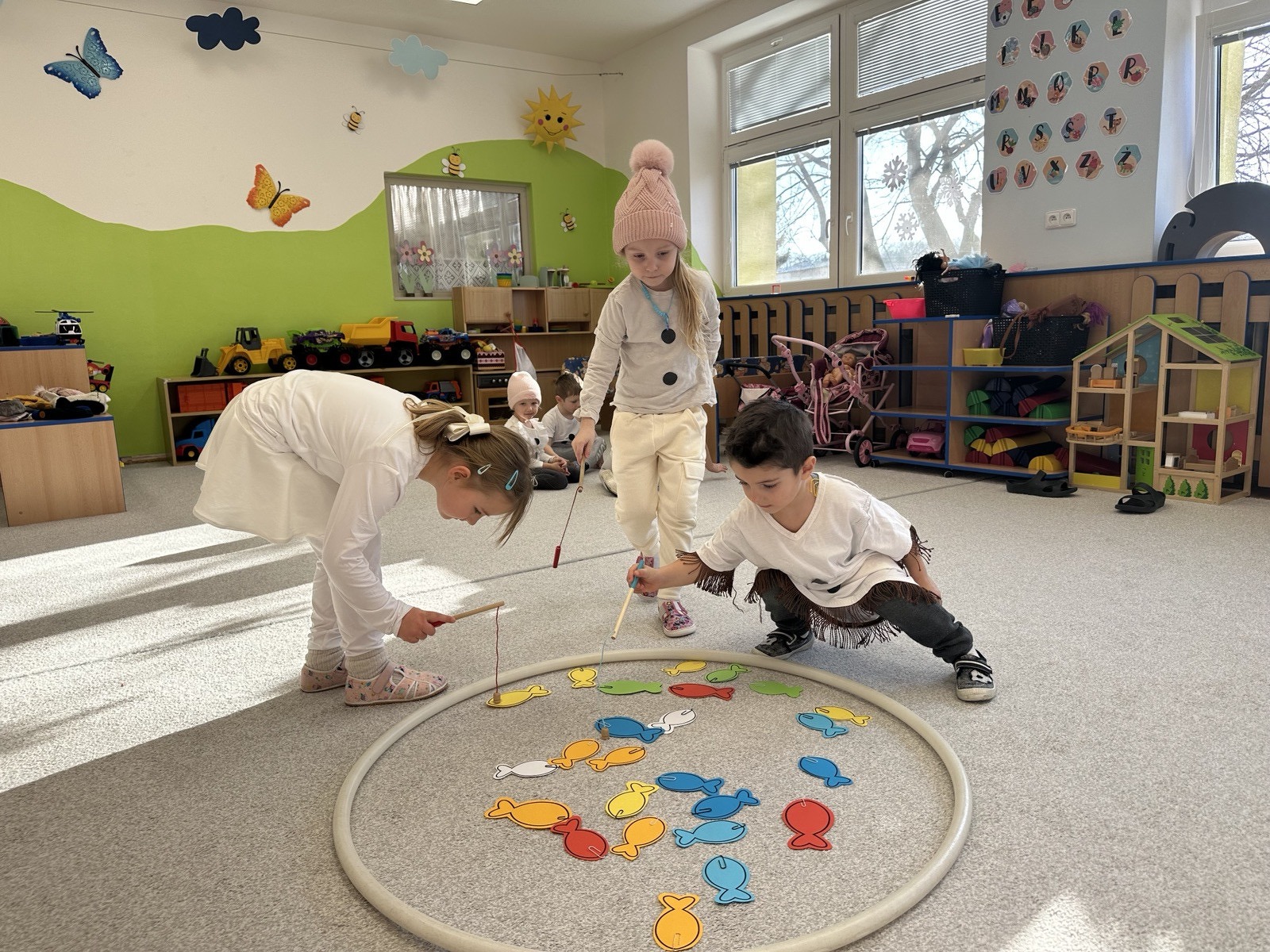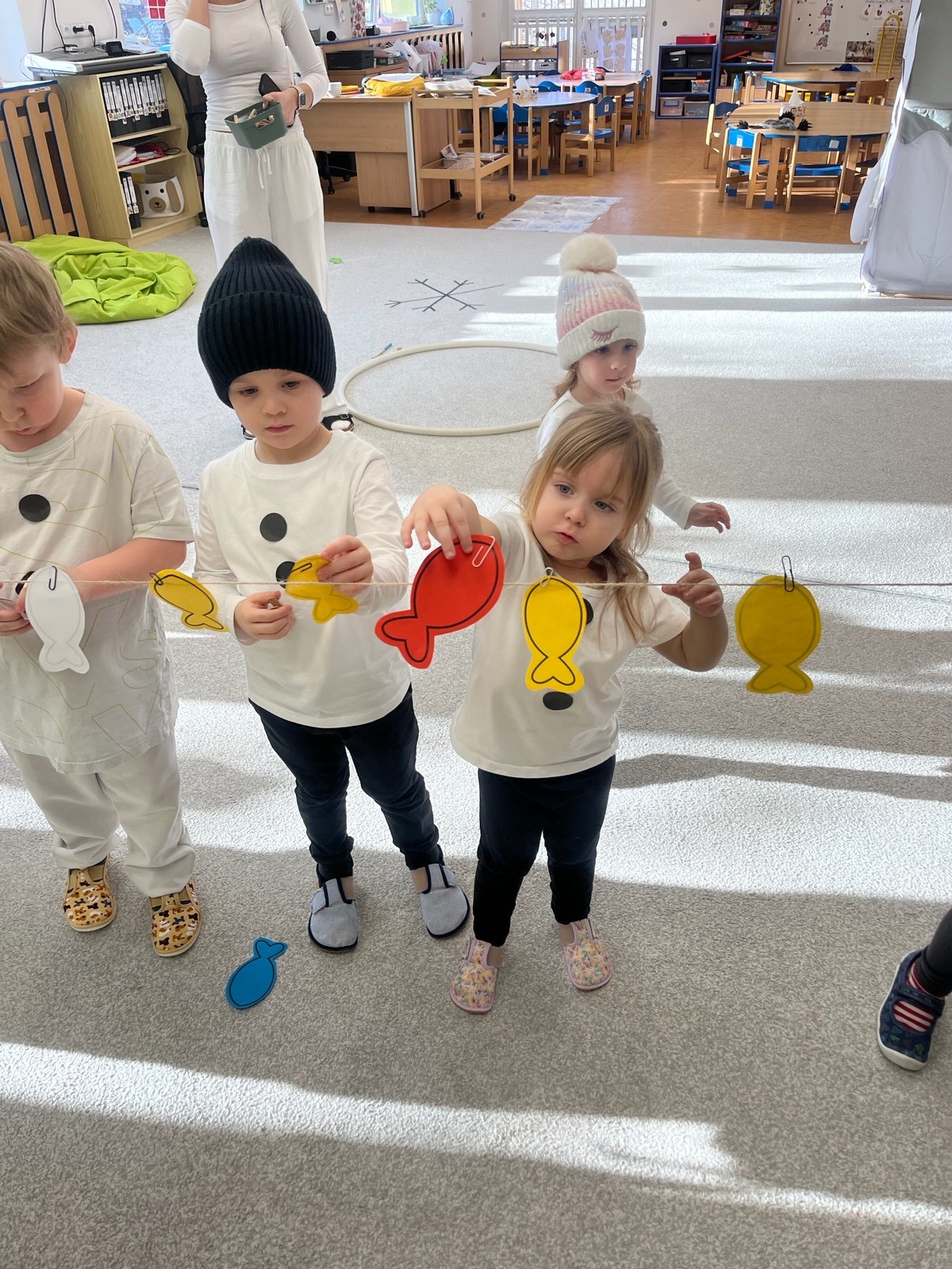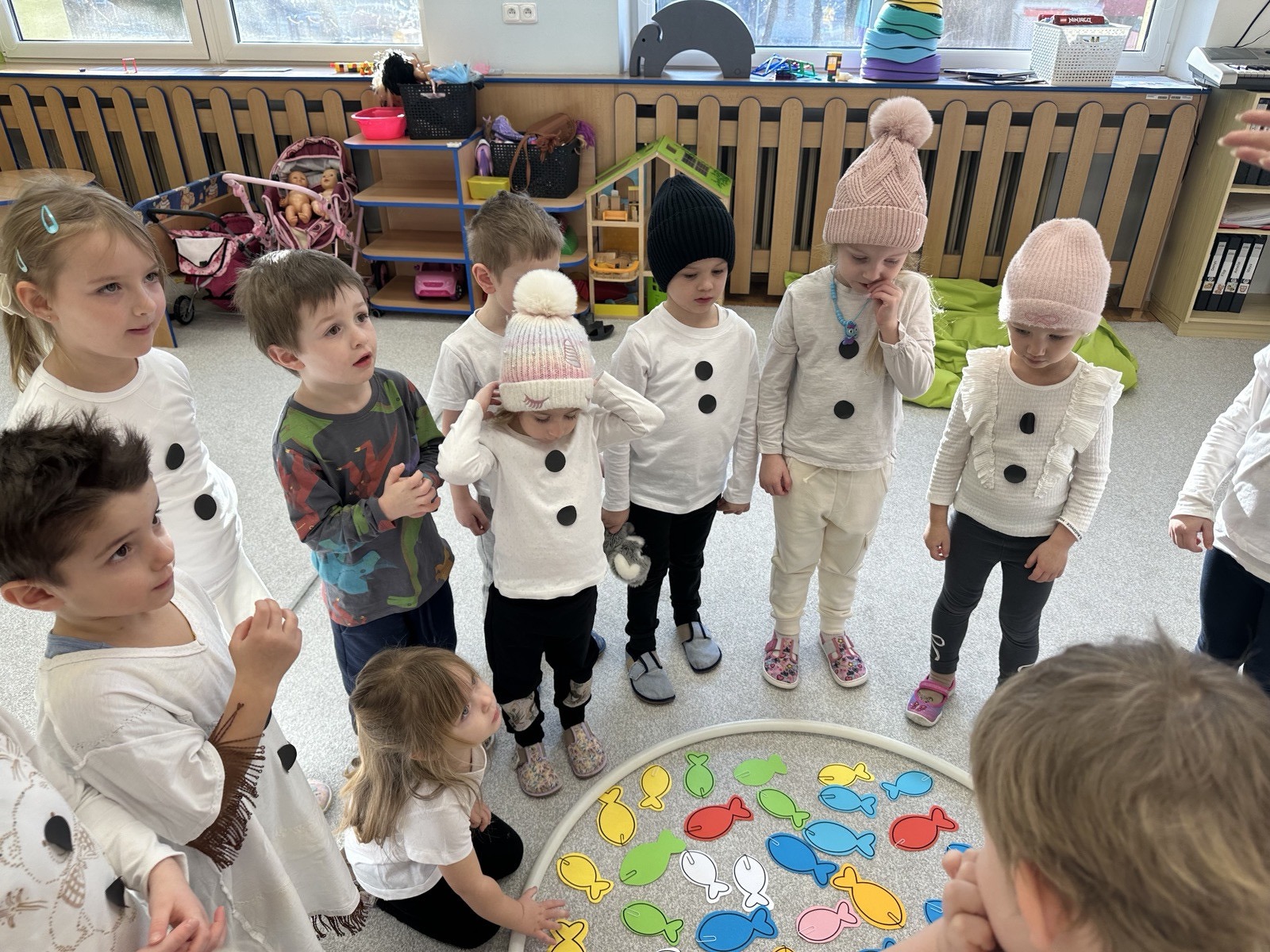 Následně jsme si zahráli hru „Hádej, koho si myslím – sněhuláčka“, při které děti hádaly kamaráda podle barevných kombinací čepic. Nechyběl ani tanec, soutěže a zábavné aktivity inspirované zimním světem: rybolov na severním pólu, věšení rybiček na provázek, proskakování obručí nebo cvičení se sněhovou koulí.